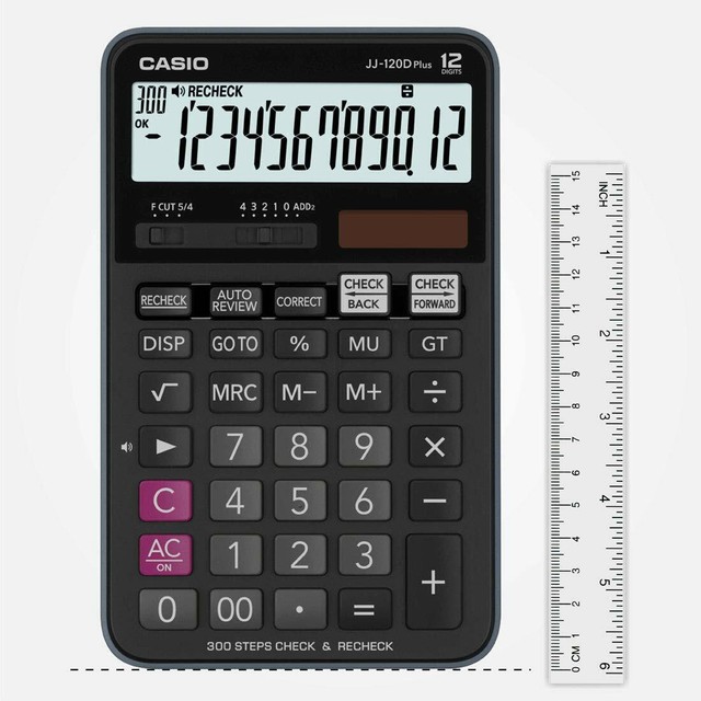 It is a two-way powered Extra Large Display Calculator. 12 Dig 300 Steps Check and Correct The recheck function allows confirmation of error by sound Easier technique for repeat Calculation Mark Up All the mark-up capabilities. Casio WJ-120D Plus Desktop Calculator.